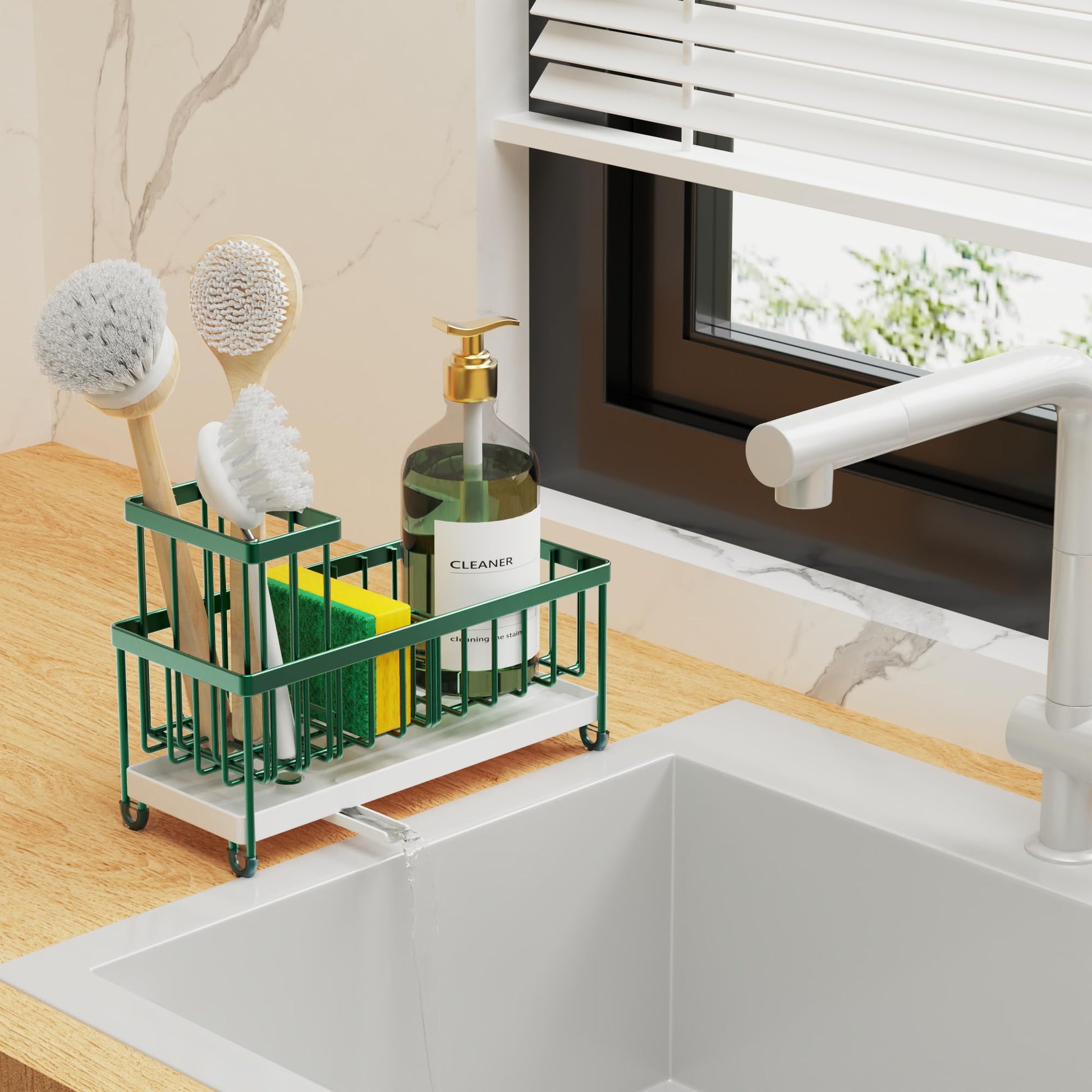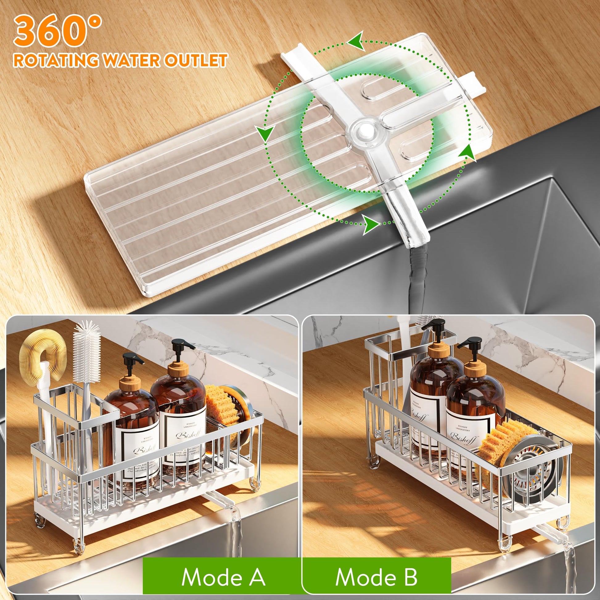 - 【ROTATABLE SPOUT】This kitchen sink caddy comes with a rotatable spout that swivels in three directions so that the water in the sponge can be directed to the sink. There won't be any water left on the countertop, you don't need to pull out the drip tray to clean it often, saving your cleaning time.
