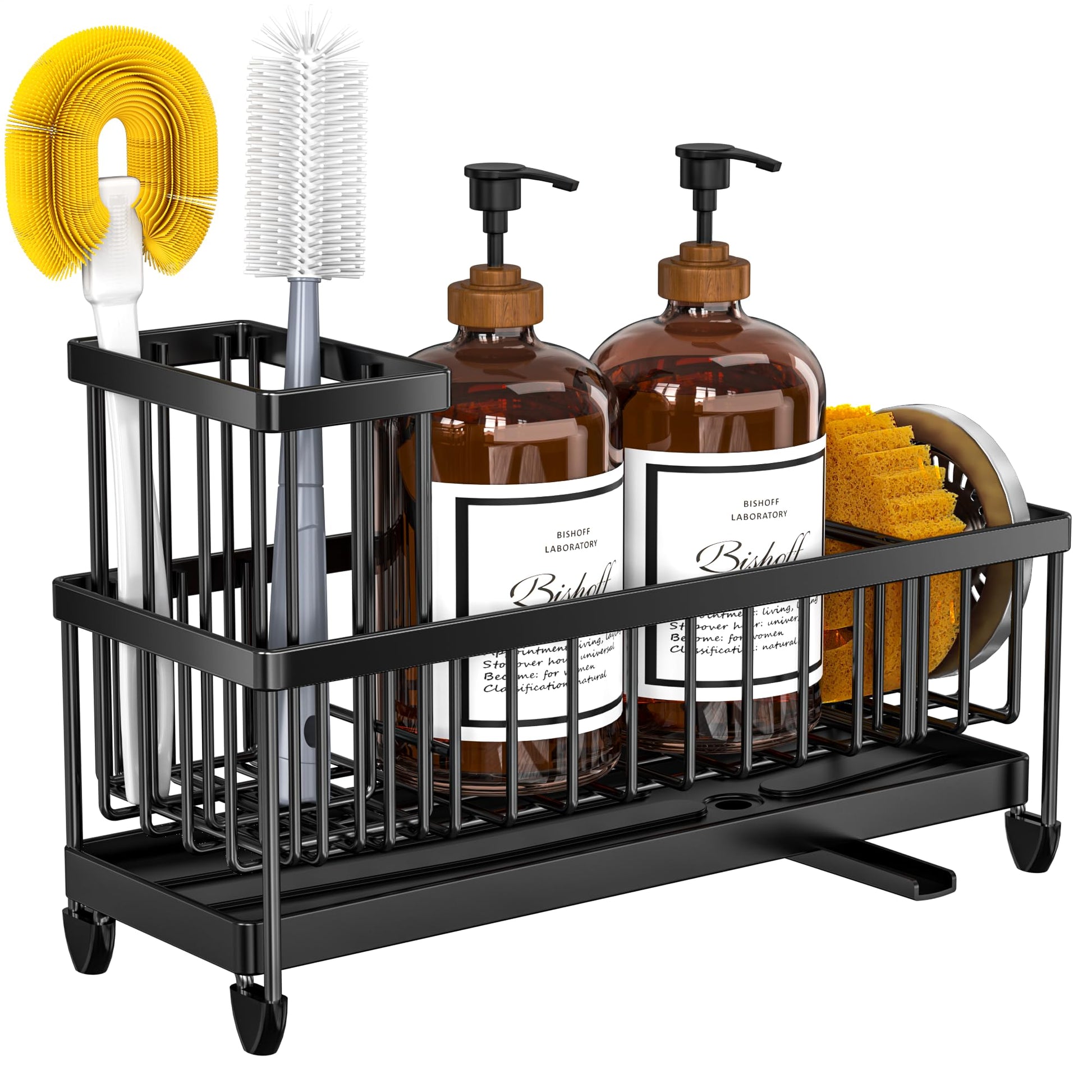 Cisily Black Sponge Holder for Kitchen Sink, Sink Caddy Organizer with High Brush Holder, Kitchen Countertop Organizers and Storage Essentials, Rustproof 304 Stainless Steel, Soap Dispenser Organize
