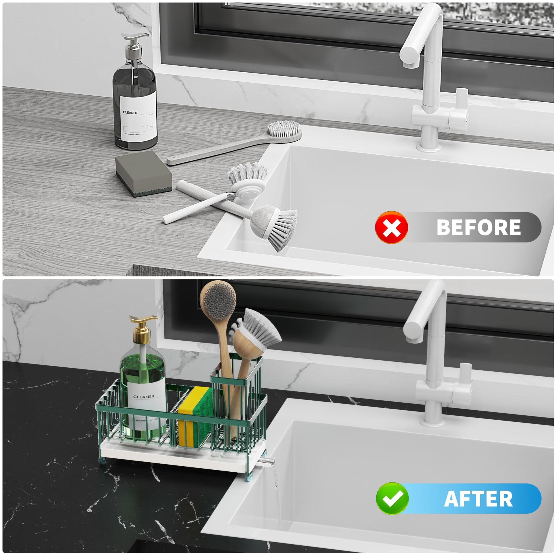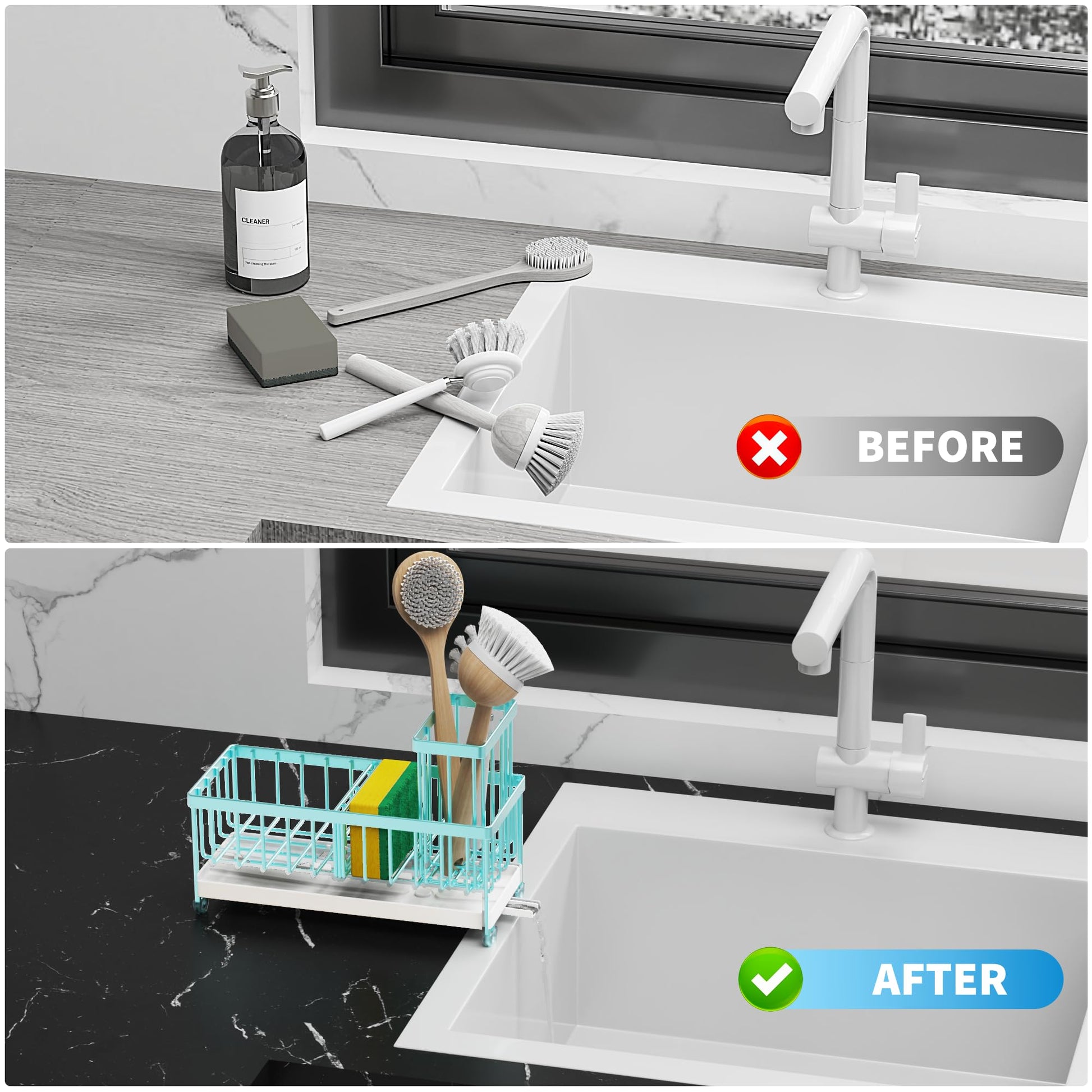 - 【REASONABLE DIVIDER DESIGN】 The sponge holder for kitchen sink ergonomic divider design allows it to have 3 separate storage spaces, Different items are placed in different areas. Make the most of every inch of space and make your kitchen look cleaner.