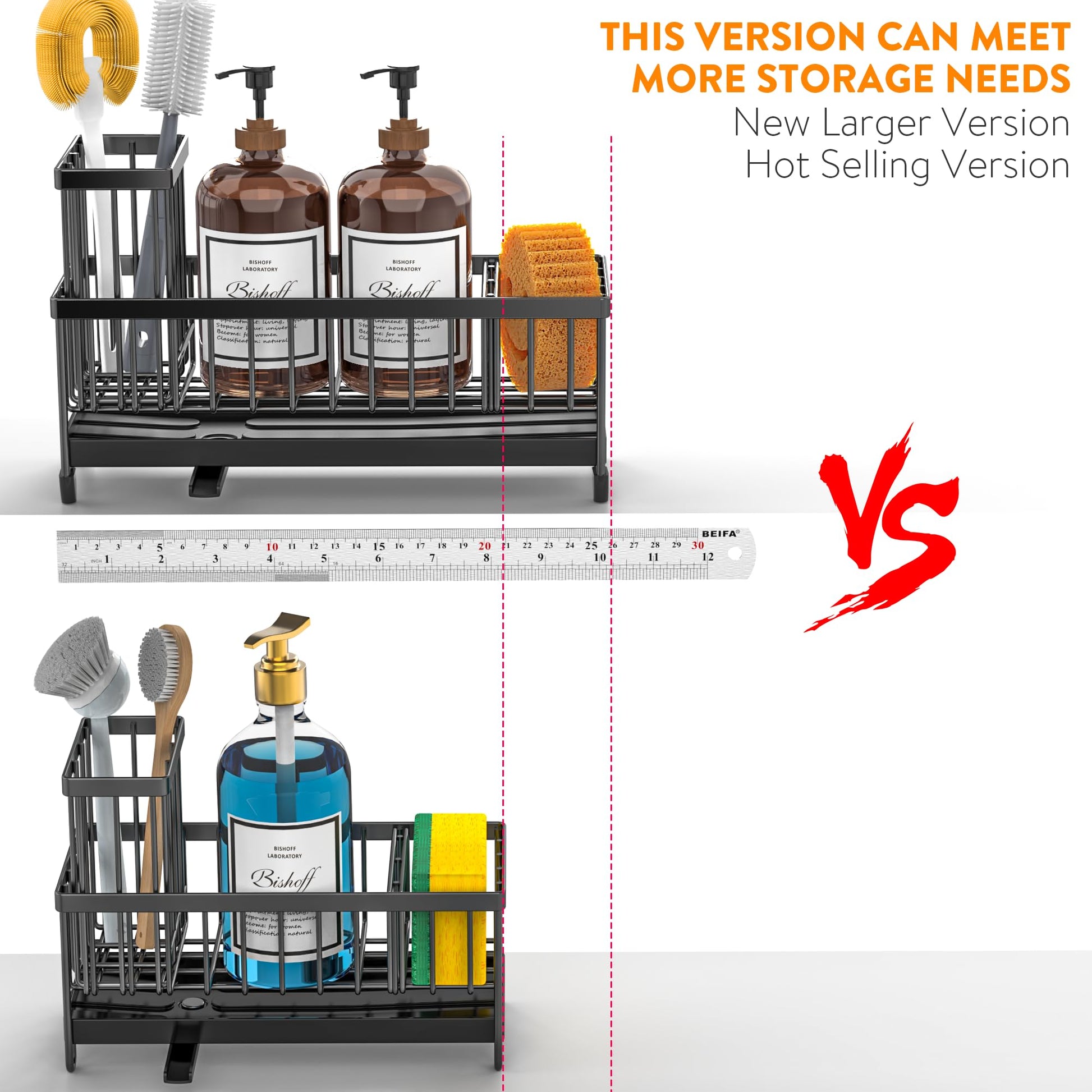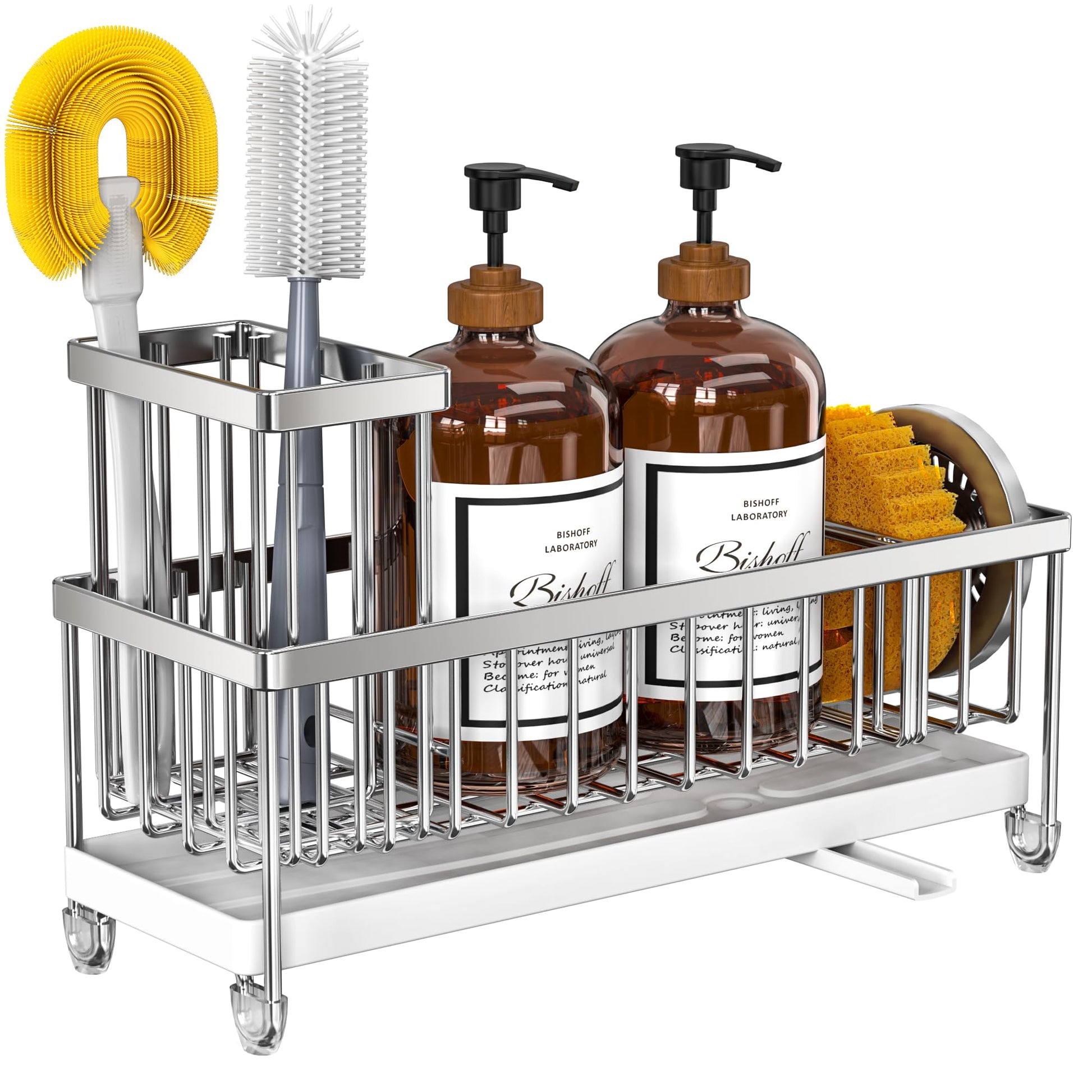- 【SMALL VOLUME】 Cisily sponge holder is suitable for kitchens with limited space. It measures only 9.25"*3.97"*6.37", Holds a detergent bottle, a sponge ball and sink stopper. With an extra upgraded brush holder that can hold up to 4 small and large sized brushes, with the Cisily Sink caddy you can save countertop space perfectly.