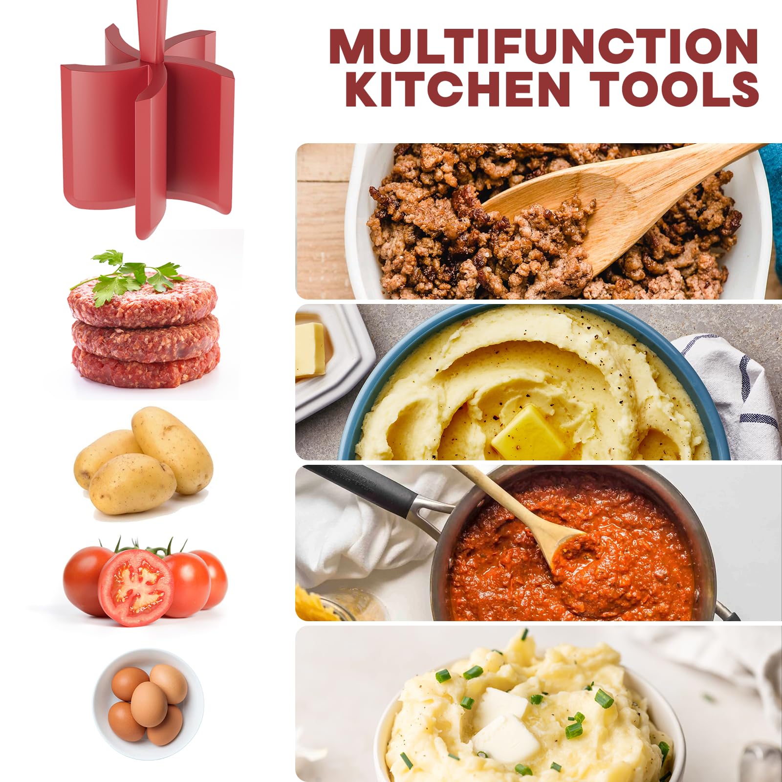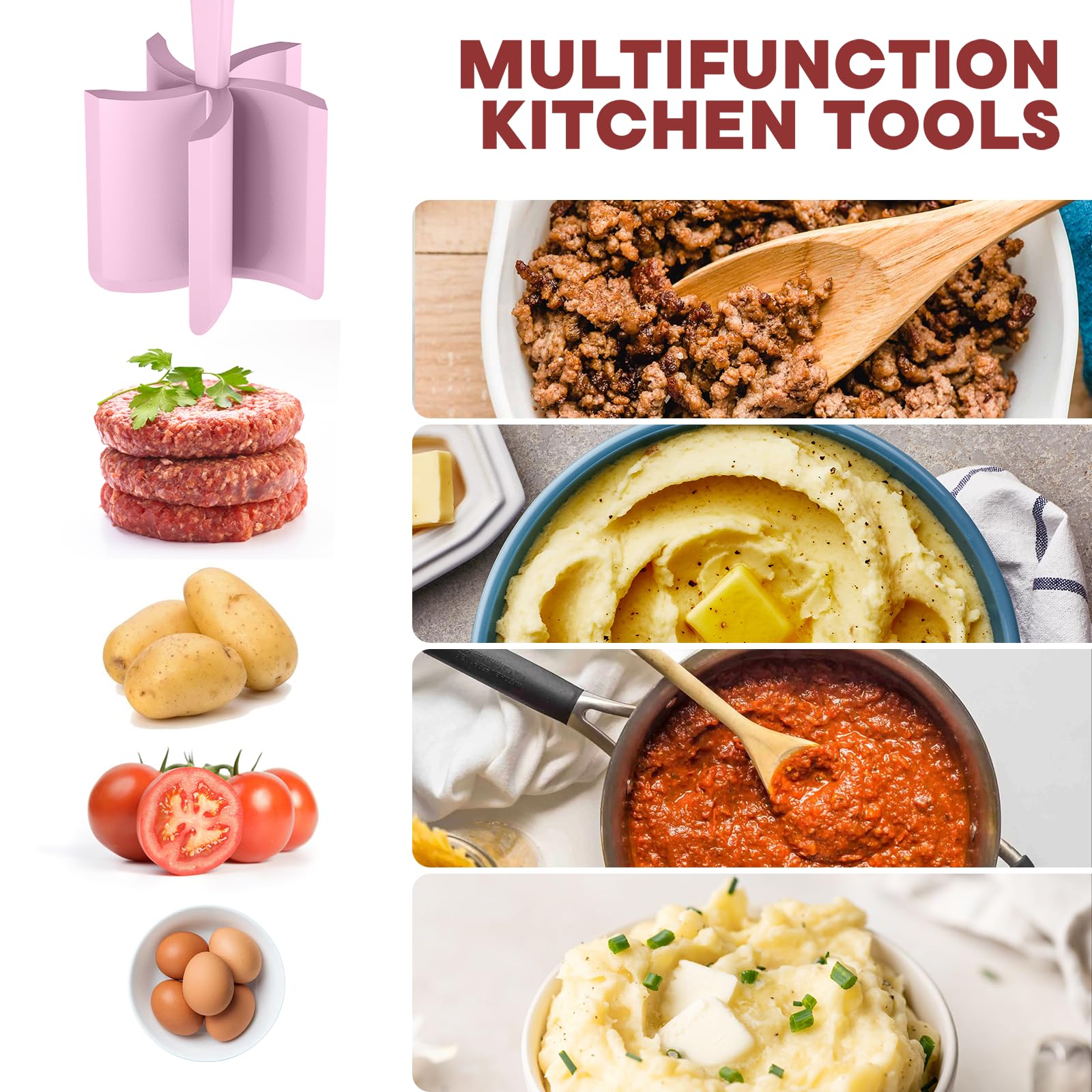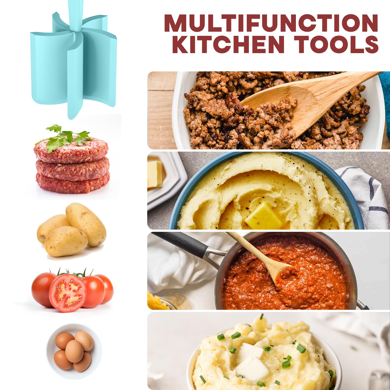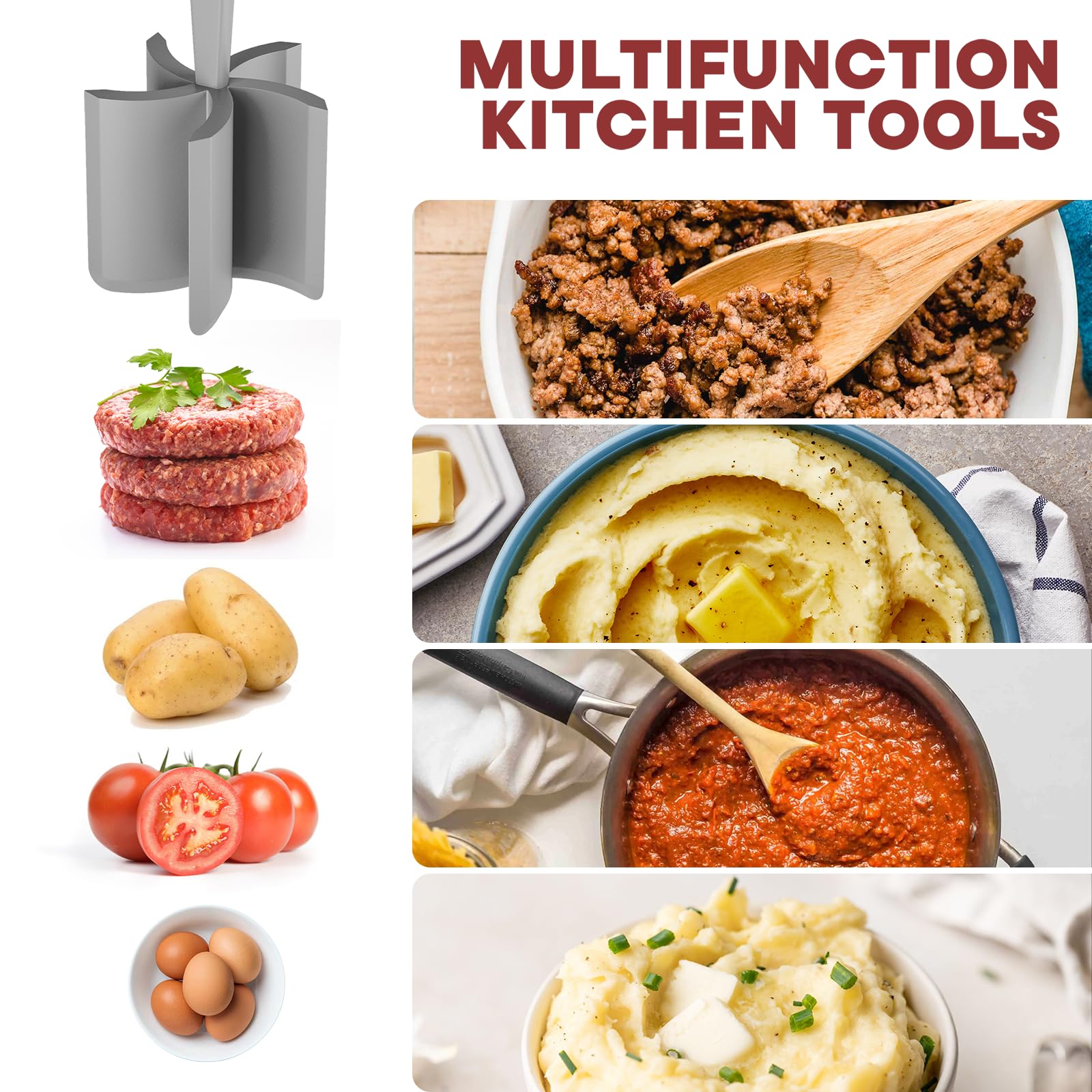- Easy To Use: Simply press the blade of the ground beef smasher into the cooked food and stir to the desired consistency; use the angled blade to scrape the sides of bowls and pots when mixing and mashing food.