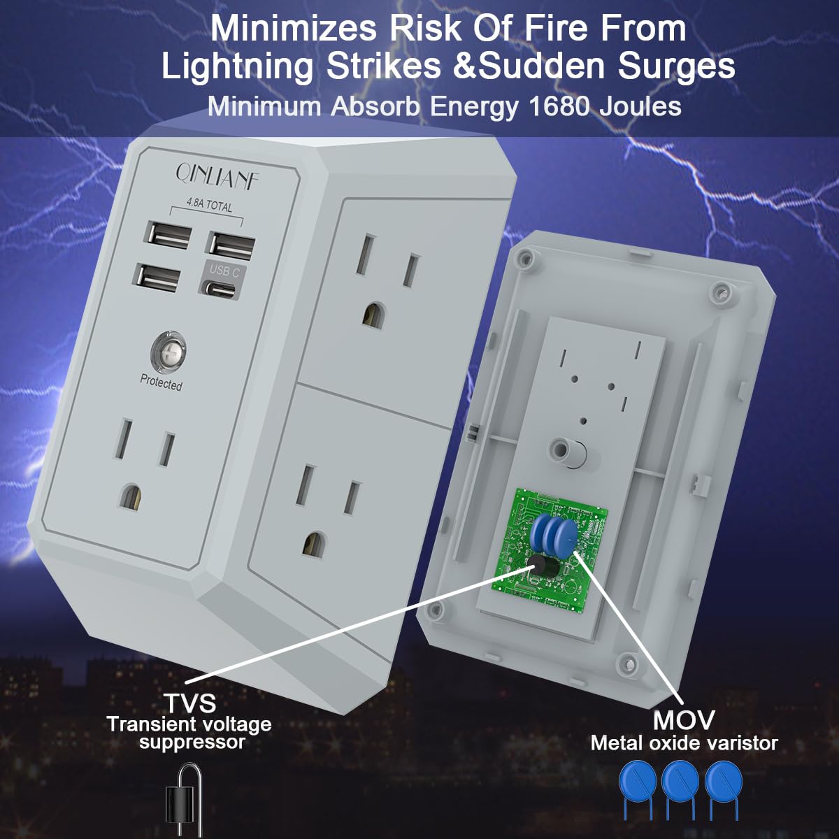 - 【 Reliable Surge Protector Circuit 】- 3 level complementary Surge Protector Circuit which composed of TVS, MOV (metal oxide varistor), GDT (gas discharge tube), with minimum 1680J energy absorbing capacity, could protect your devices much more quickly and reliably than other brand’s 1 level MOV(metal oxide varistor) Surge Protection Circuits.
